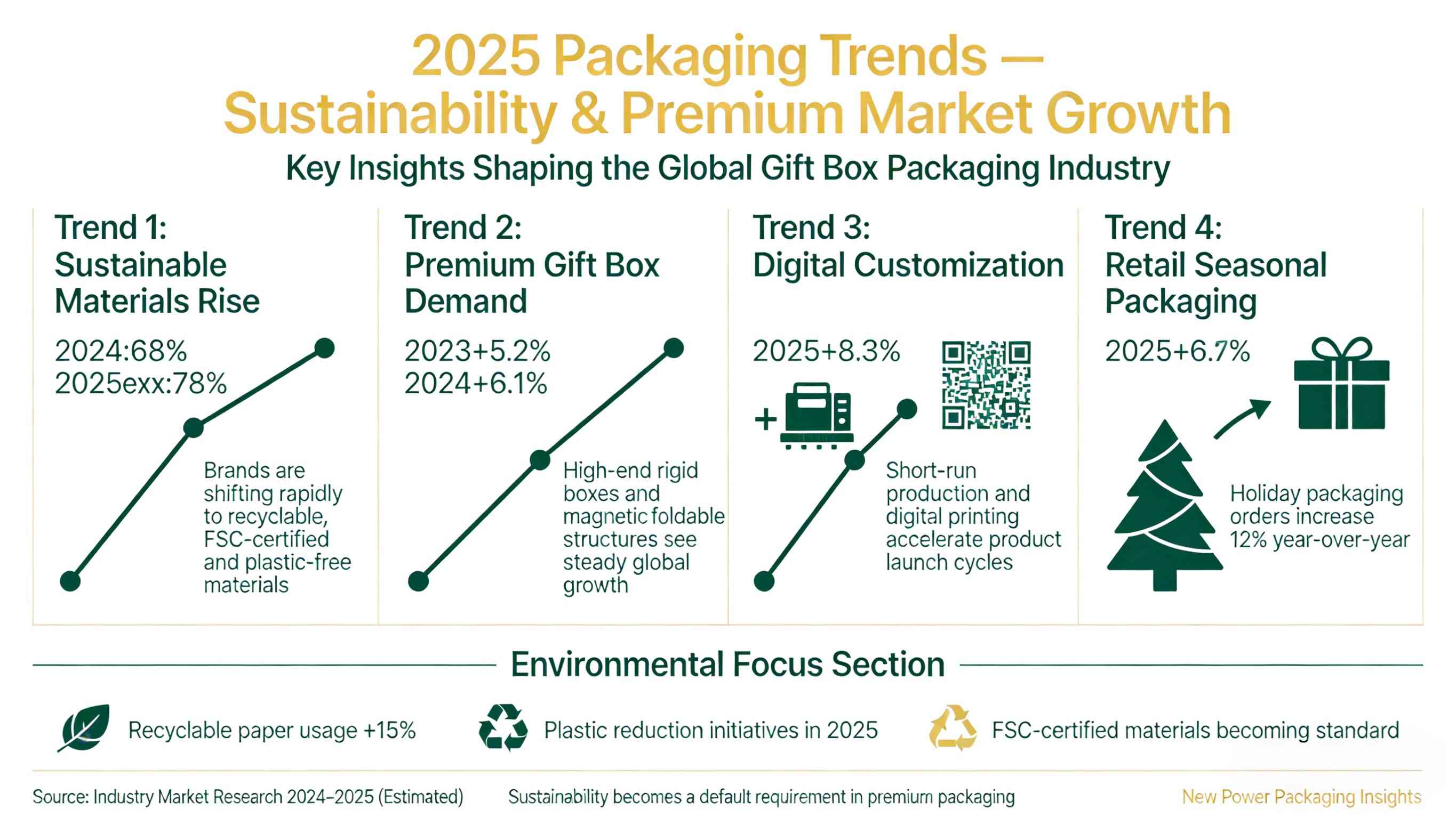 시장 조사 예측: 프리미엄 선물 상자 시장은 2025년에 6%~9%의 성장을 유지할 것입니다. 지속 가능한 포장 부문은 12% 이상 성장할 것입니다. 디지털 인쇄 및 단기 맞춤 주문이 가장 빠르게 확장될 것입니다. 앞으로 2025년 포장 산업은 지속 가능성을 기반으로, 시각적 매력을 강조하고, 속도를 경쟁 우위로 하는 보다 명확한 방향을 반영할 것입니다.